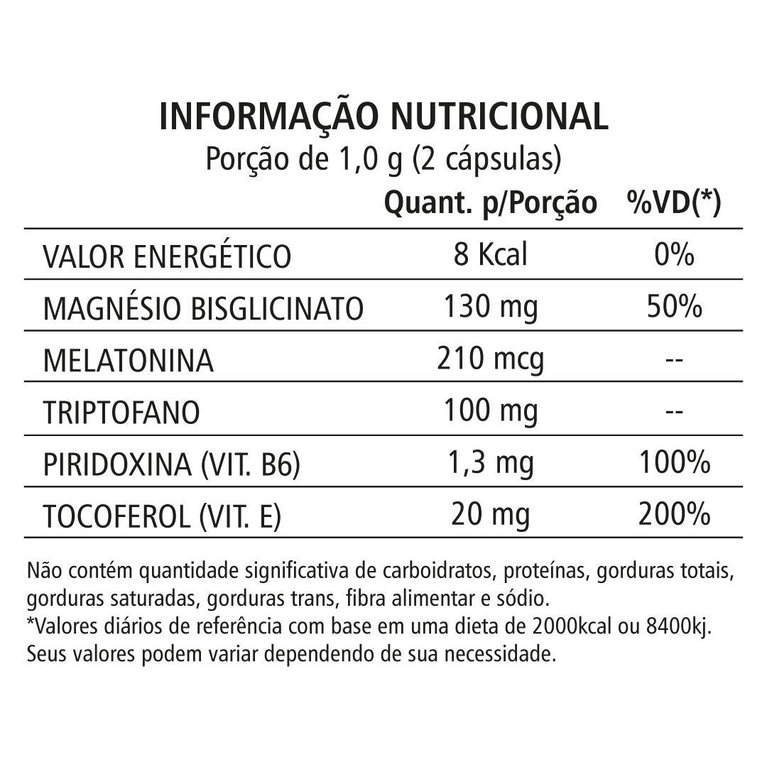 Composição: Maracujá (Maltodextrina) em pó solúvel, Melatonina, Triptofano, Piridoxina e Tocoferol; Excipientes: Silicato de Magnésio, Estearato de Magnésio; Antiumectante: Dióxido de Silício;